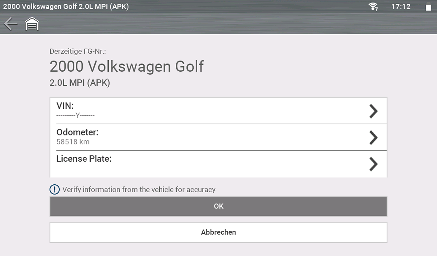 Wenn die Fahrzeugidentifikationsnummer ausgelesen wird, ertönt ungefähr sechs Sekunden nach dem Start ein Piepton. Wählen Sie OK, um fortzufahren.