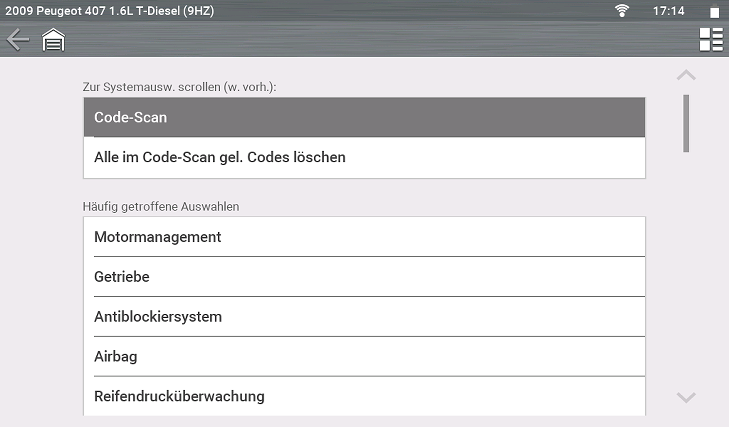 Nach der Identifikation des Fahrzeugs wird ein Menü mit den verfügbaren Systemen und/oder Prüfoptionen angezeigt.