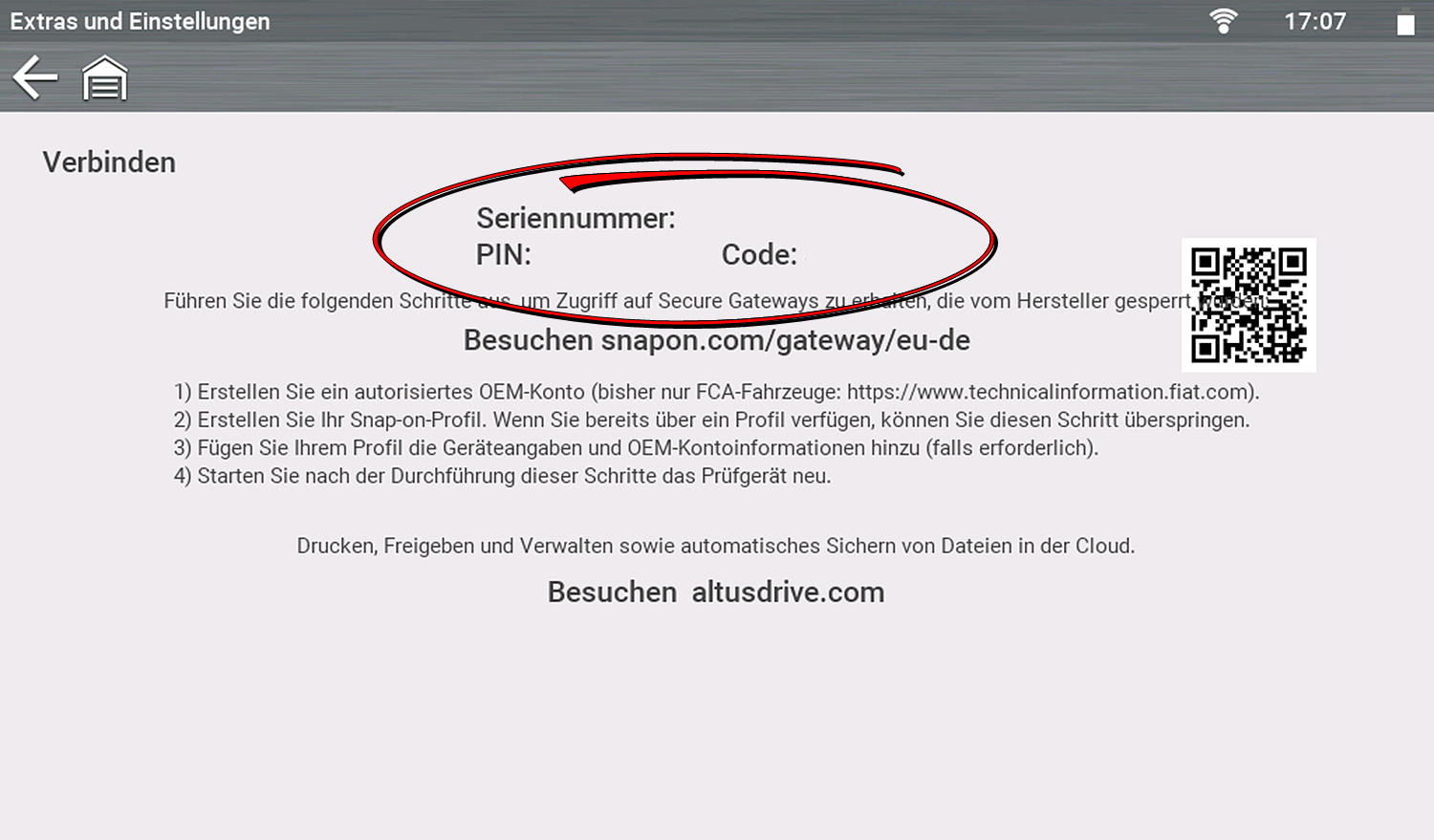 Auf diesem Bildschirm werden die Seriennummer des Diagnosewerkzeugs, die PIN und der Code angezeigt, die verwendet werden, um Ihr Werkzeug mit Ihrem Snap-on-Technikerprofil zu verknüpfen (damit Sie andere Apps wie die Snap-on Cloud und Security Link nutzen können).