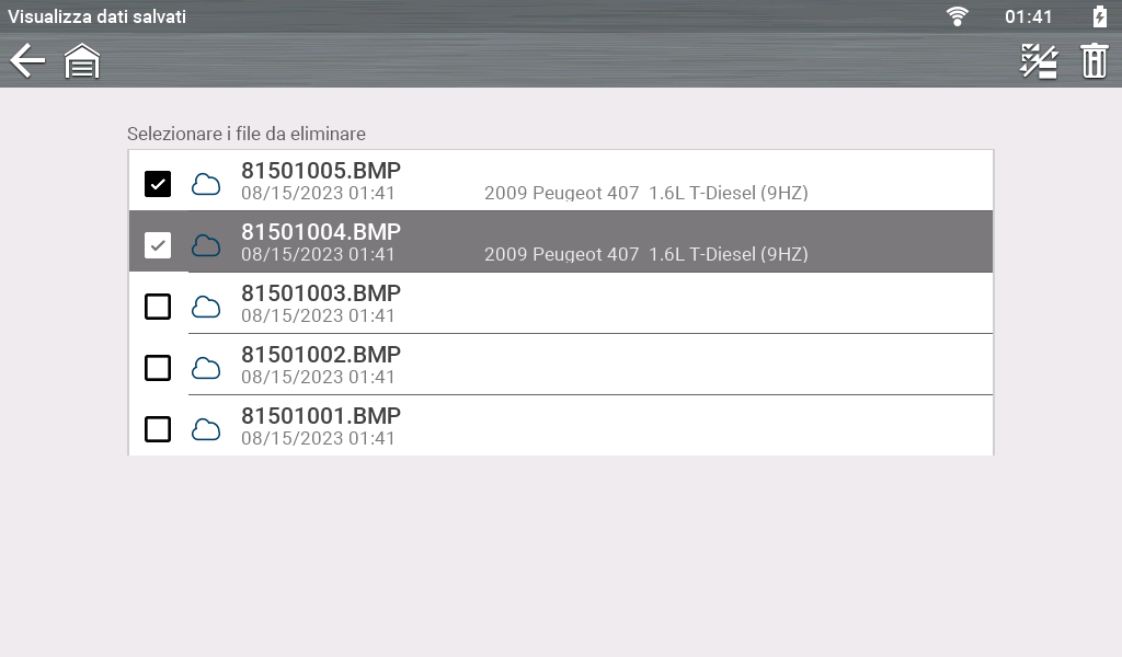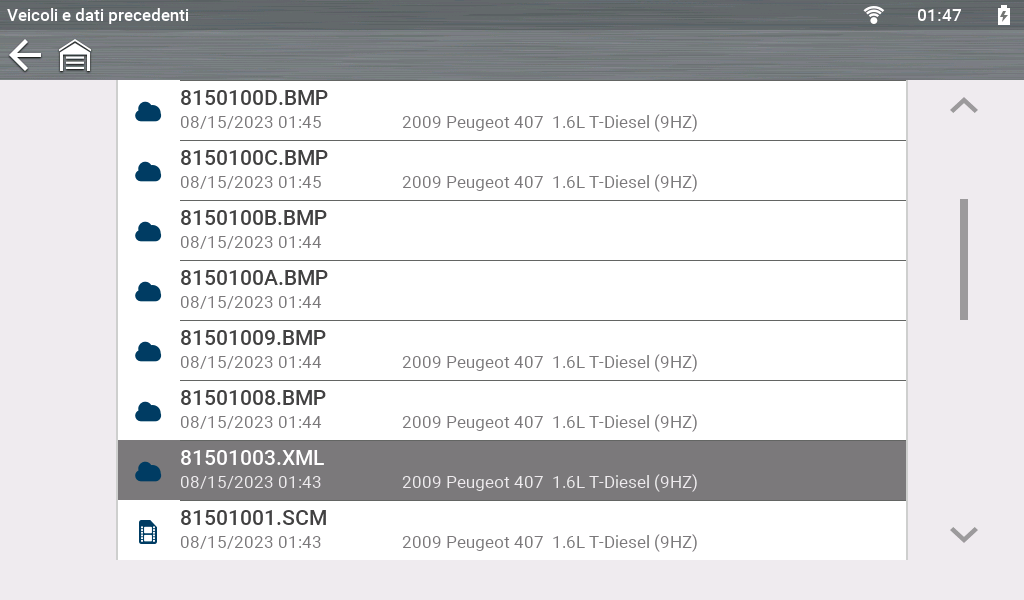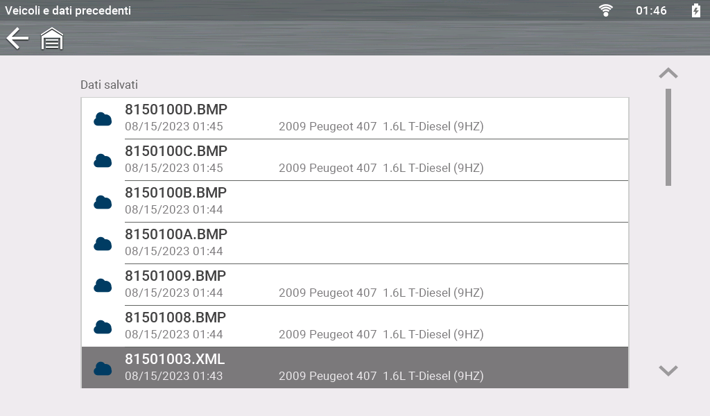Le scansioni dei codici del veicolo e le singole scansioni dei codici di sistema vengono salvati in formato di file (.XML). Selezionare un file dall'elenco per visualizzarlo.