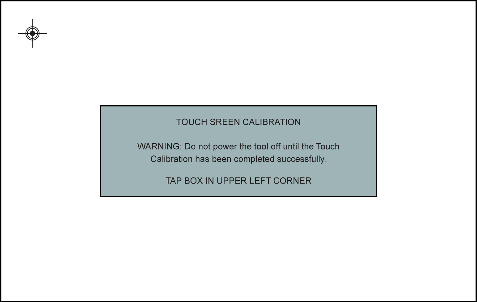 This feature is not applicable to all tools. Calibrating the touch screen maintains the accuracy of the touch-sensitive display. To avoid serious damage to the diagnostic tool, always complete the touch screen calibration sequence once it has begun. Never turn off the diagnostic tool while a screen calibration is in process. = Home Screen > Tools > Settings > System Settings > Display > Calibrate Screen The calibration screen