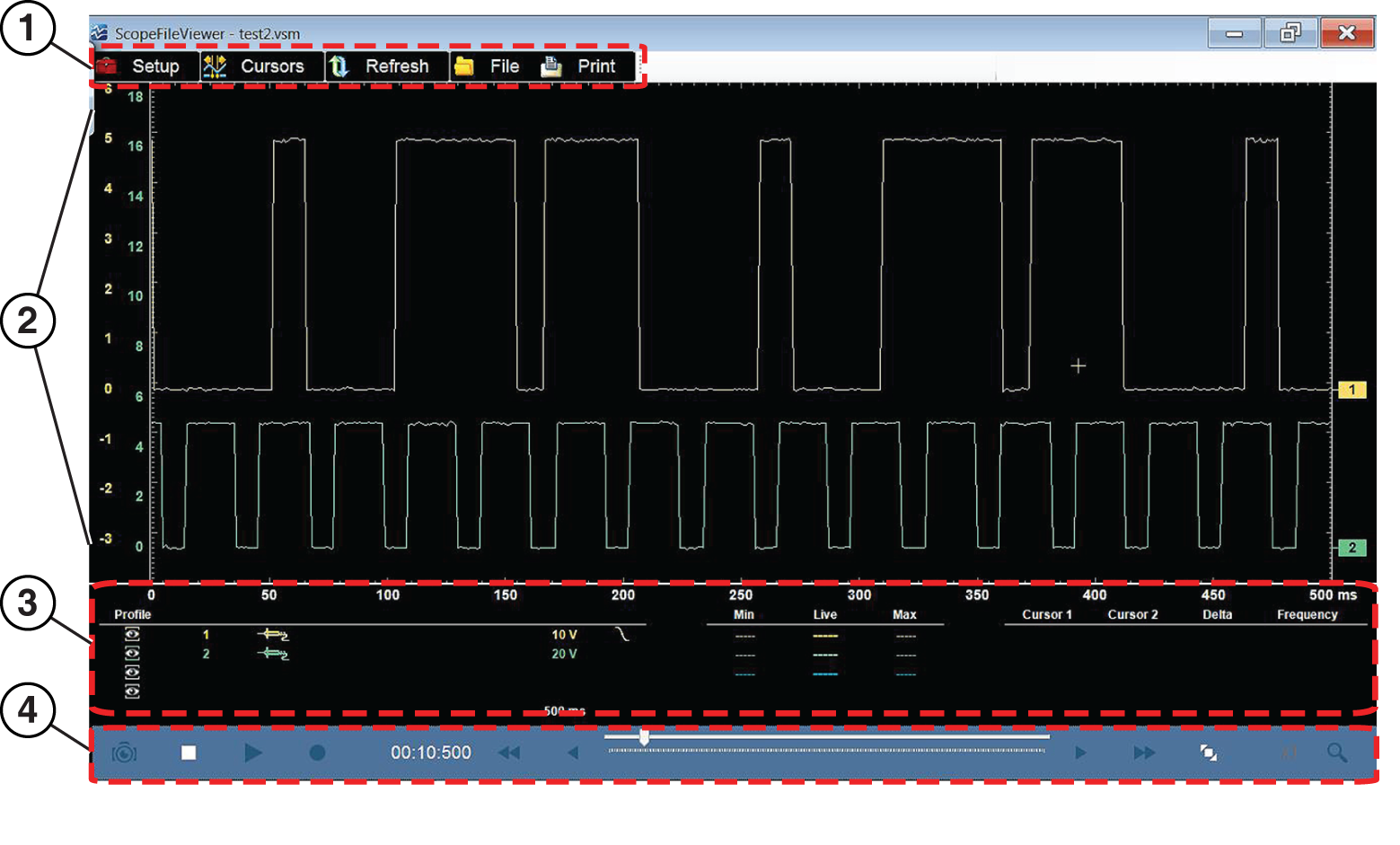 Many of the navigation features are similar to those used in the operation of the Scope / Multimeter, see Record/Playback Control Toolbar. Some Scope File Viewer icons may not be available or grayed out, this is normal as those features are only applicable when viewing live trace signals.