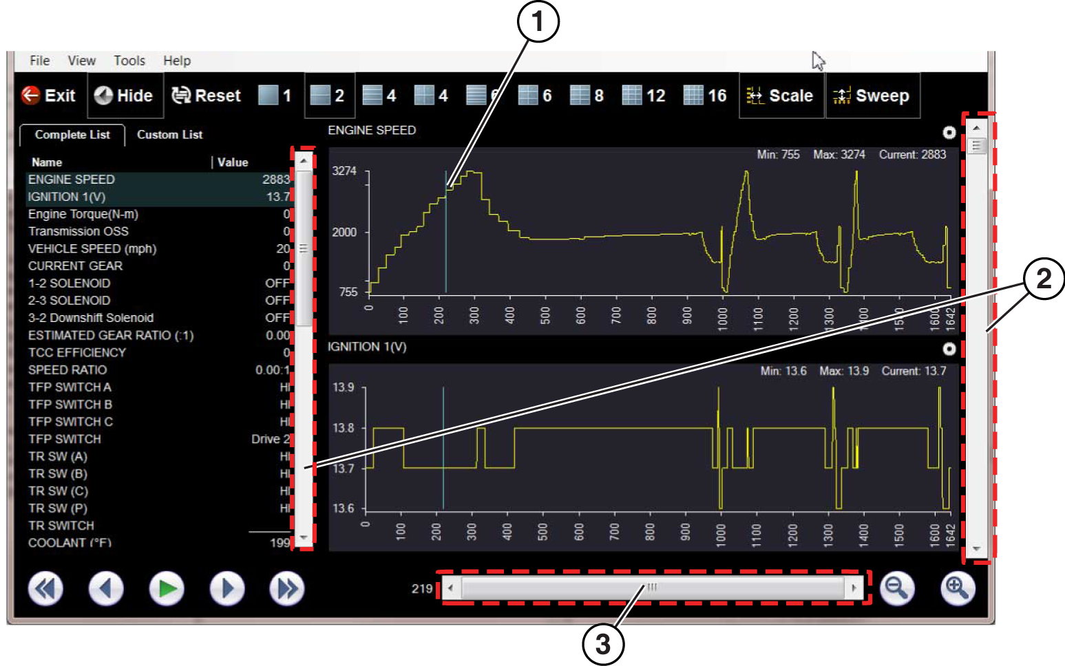 Use the slider bar to quickly navigate through the data. During playback the number displayed on the left side of the slider bar indicates the current position of the cursor in the data file. The cursor can be repositioned during playback or when paused by selecting and dragging.
