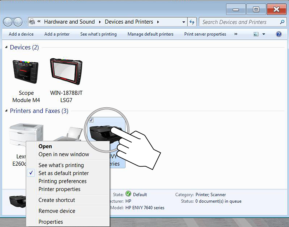 | 3. | Touch and hold the icon of the printer you want to set as the default, until the optional menu indicator (circle outline) appears and then release (this is also known as right-click menu). From the menu, select “Set as default printer”. When set, a check mark is displayed next to the option . |