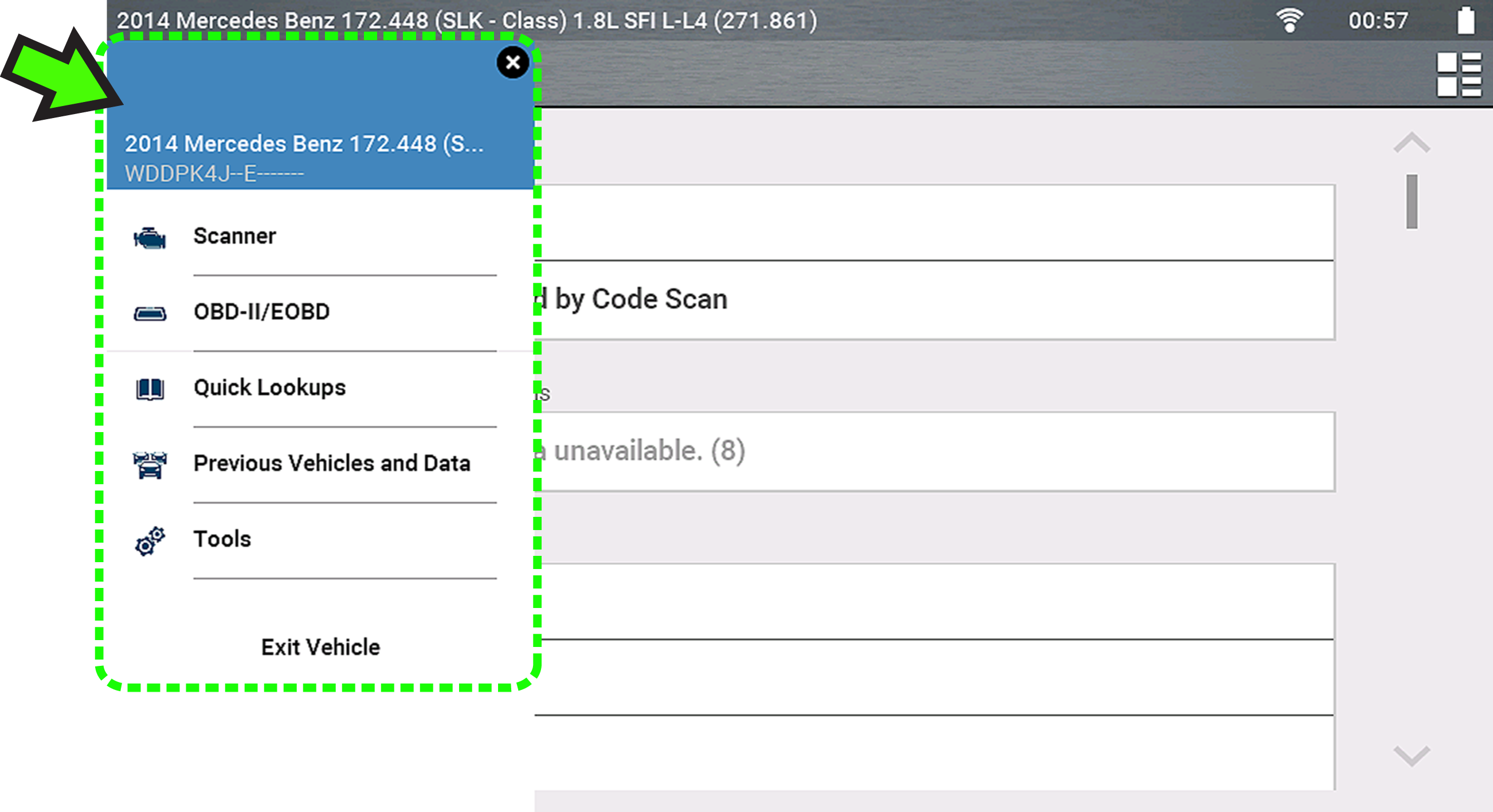 Selecting the Home icon opens the Quick-Access menu, depending on your location in the software. Use this feature as a shortcut to “jump” between functions, or to Exit the active vehicle. For additional information see Quick-Access Menu.
