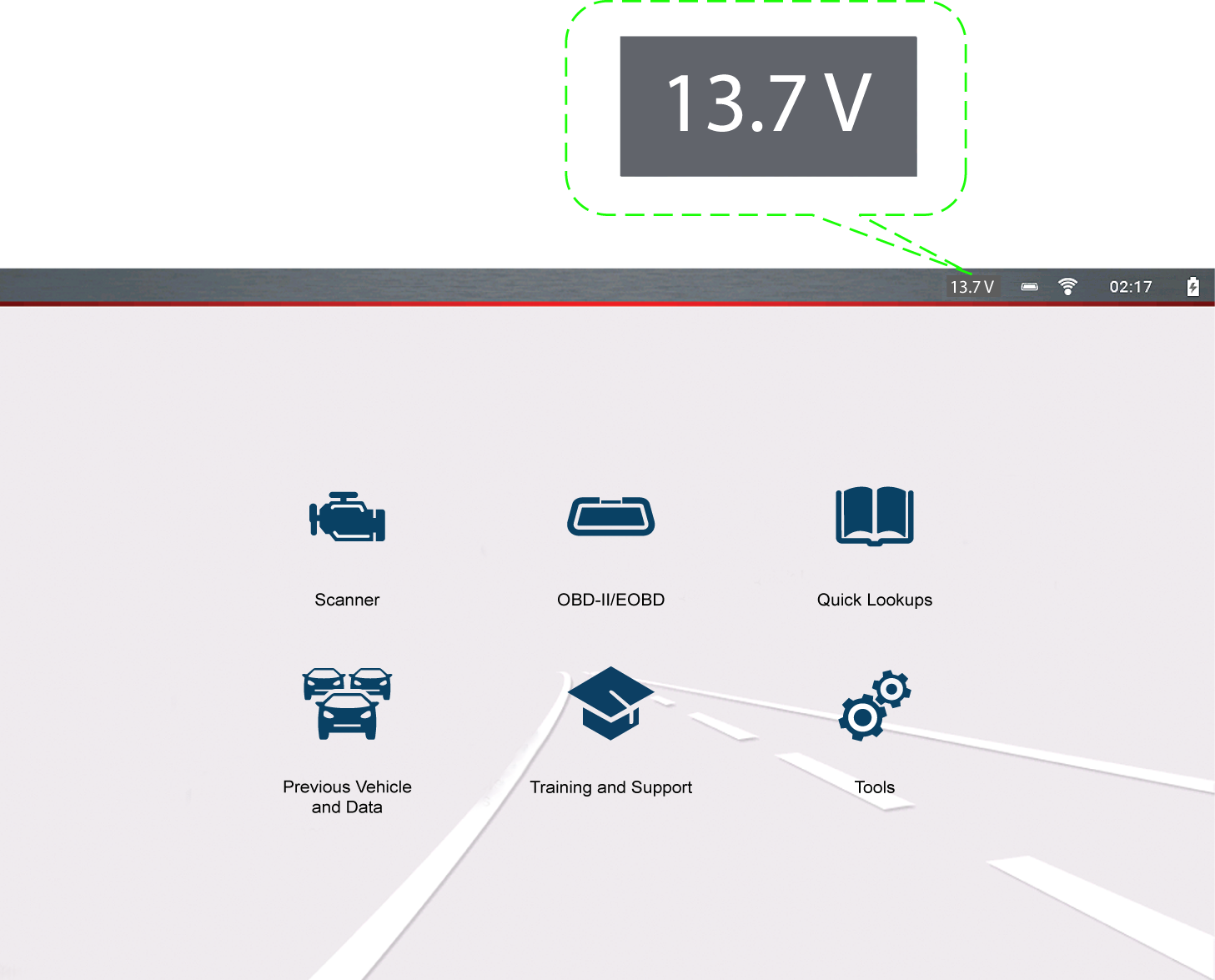 When the data cable is connected to the vehicle, the vehicle’s battery voltage (at the data link connector) is displayed on the top of the screen.