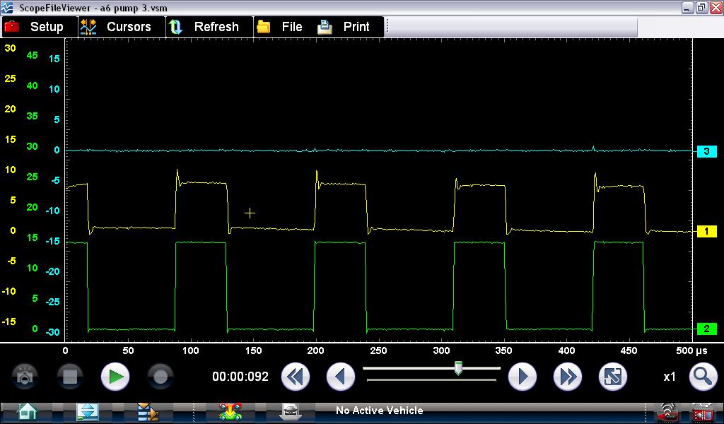 Figure 1 shows the current flow through a “brushed” fuel pump from a Ford Focus. The commutator has eight segments, each segment has a slightly different current profile. By identifying one segment we can use the cursors to calculate the time for one revolution of the pump. In this example the pump speed is 8.61ms for one revolution. This equates to almost 7,000 RPM. The calculation for this is, there are 60,000ms in one minute, so