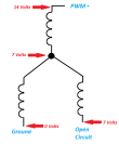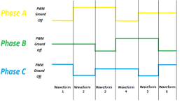 This table demonstrates the module control of each phase during operation. At any one time a phase is on (PWM), connected to ground or uncoupled from the circuit. Figure 4 helps show what that should visually look like.