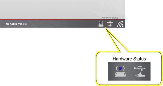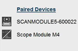 When the Scope Module is connected (via USB cable), it automatically pairs with the diagnostic tool. To pair the Scope Module, connect it using the USB cable then check the connection status by selecting.... = Home Screen > System Settings > Paired Devices The Paired Devices screen lists all of the devices paired to the diagnostic tool, and also indicates whether or not there is active communication occurring. The Scope Module will be listed as SCOPE MODULE M4 or similar. If the Scope Module is not shown in the Paired Devices list, check to make sure it has a good connection. Use the Hardware Status icons shown below to determine connection status,. The hardware status indicators in the lower-right corner of the Home screen.