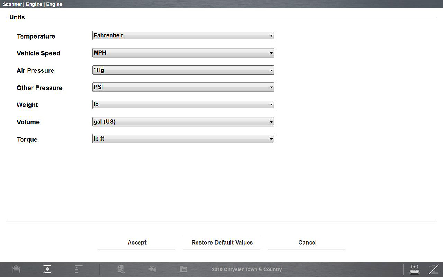 The Diagnostic Suite units of measurement can be changed for temperature, vehicle speed, air pressure and other pressure readings. Choose between US customary or metric units of measure.