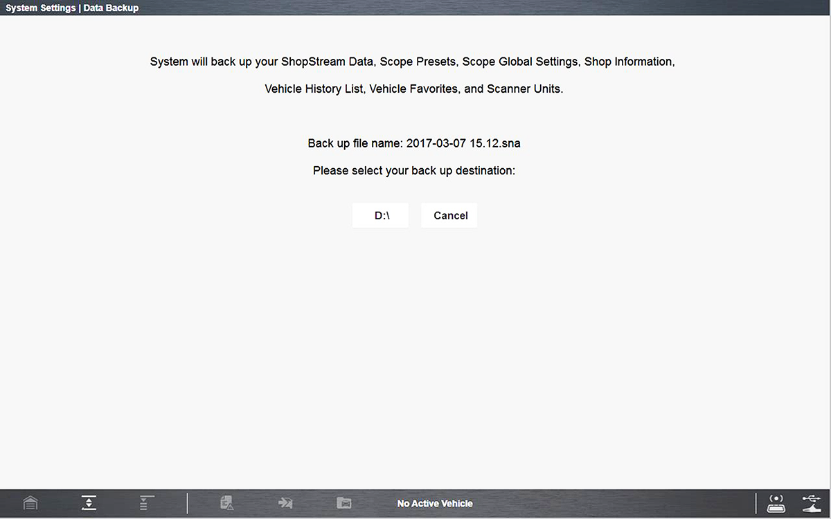 Drive designations (e.g. E:, F: etc.), are only visible when external drives are connected to the diagnostic tool. A progress screen is displayed as the backup file is saved to the root of the drive selected with a file extension of .sna. Then a confirmation screen is displayed.