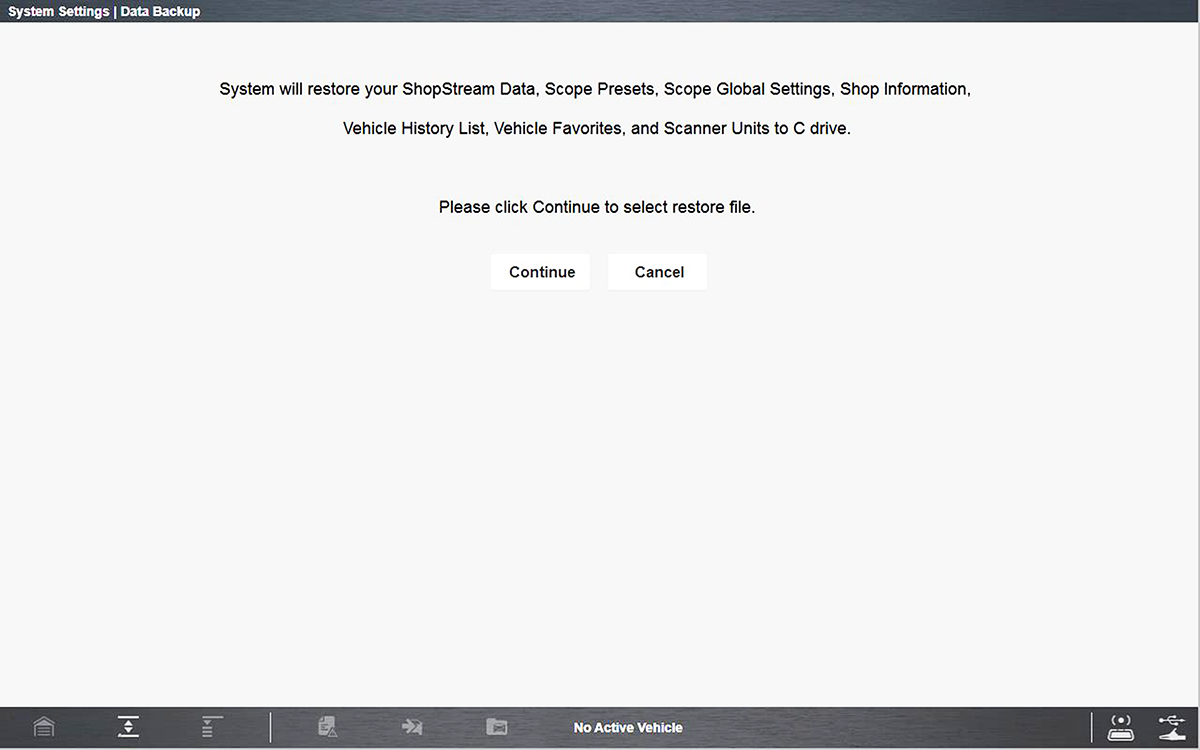 The Restore option is used to restore your backed up data, in the event that the data is lost or if a system restore (recovery) has been performed. This function is only applicable when a backup file has been previously saved (file extension .sna). See Backup (above) for additional information.