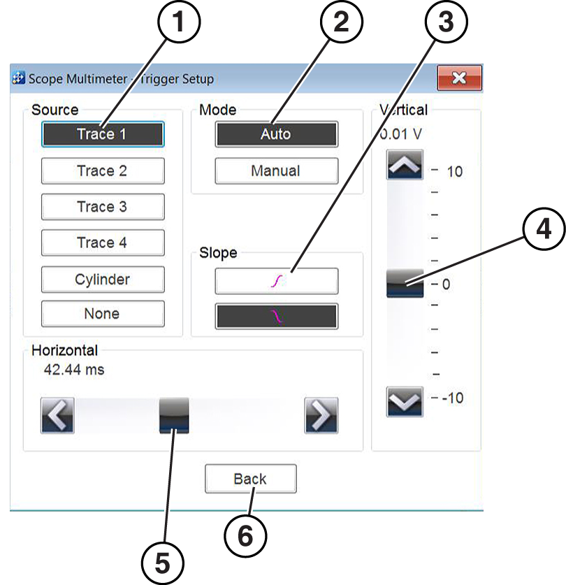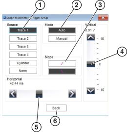 Trace 1 to 4—sets the trigger for the applicable channel. Cylinder—sets triggering to the firing of a cylinder detected by the optional RPM Pickup or Secondary Ignition Adapter. None—switches triggering off.