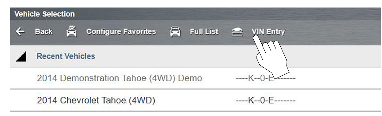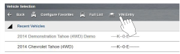 On the "Select Make" screen when you are selecting the vehicle OEM, select Configure Favorites from the upper toolbar. This feature allows you to custom configure the manufacturer list to display only the makes you frequently service. Select each manufacturer you want to include, then select Finished to save the list. Manufacturers appear on the favorites list in the order in which they are selected. Therefore, if you select the makes you work on most frequently first, they will appear at the top of the list. After saving a custom list the “Favorites” toolbar selection now displays a “Full list” option also. Select Full List on the toolbar to view the complete list of manufacturers. |