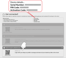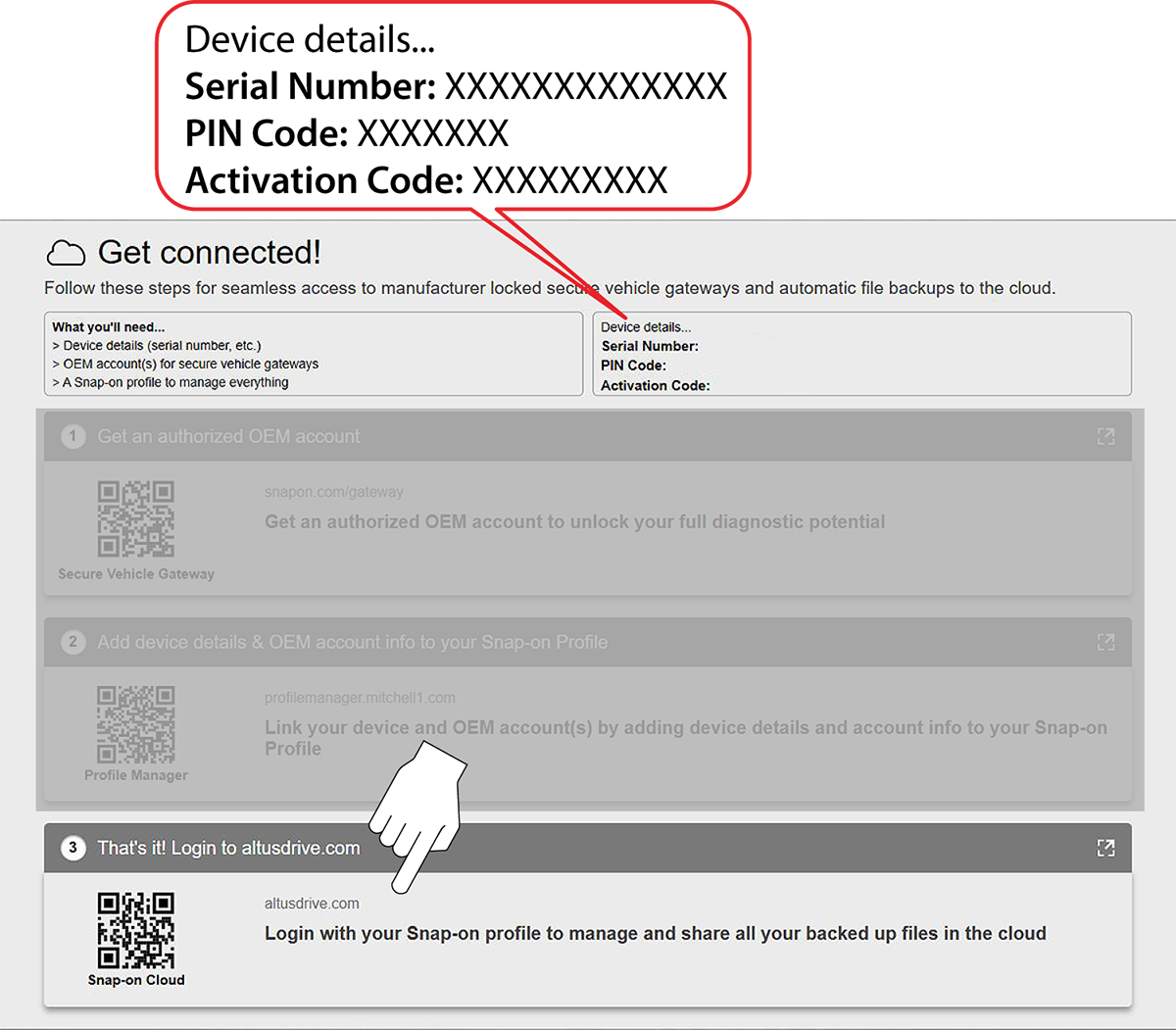 Get Connected allows you view the diagnostic tool serial number, PIN and Code needed to create a Snap-on Technician Profile, which then allows you to use companion applications, like the Cloud and Security Link. = Home Screen > System Settings > Get Connected The numbers and codes needed to create your Snap-on Profile account are found on your diagnostic tool (see image below). The device Serial Number, PIN and Code needed to register are displayed onscreen.