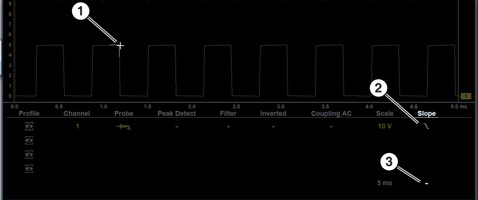 When using Manual Trigger, it may be easier to initially set the trigger point using Auto Trigger, as the screen will update regardless if the signal crosses the trigger point. Once the trigger point is set, then switch to Manual Trigger mode. Trigger Slope Icons Trigger slope icons are displayed in the control panel.