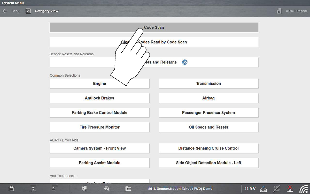 Most all ADAS recalibrations are performed using the Scanner function on your diagnostic tool. Select Scanner, then choose the applicable vehicle system and navigate to the desired function or test. NOTE - Some ADAS tests are displayed on top level menus, so be sure to scroll through the complete menu during navigation. Depending on the vehicle and recalibration test, special recalibration equipment may be required. For additional information about Snap-on ADAS recalibration equipment visit EZ-ADAS Hub. ADAS Recalibration Report Form Depending on the vehicle (if supported), an ADAS Recalibration Report form may be available after performing an ADAS recalibration test. The ADAS Recalibration Report form allows you to print the form with your shop information, the vehicle’s VIN, odometer and license plate information. The recalibration information is manually entered after the form is printed. When an ADAS report is generated, press the SAVE icon to automatically uploaded it to the From the Cloud you can print or share the report. EZ-ADAS Recalibration instructions and user guides are integrated within the Mobile APP and website at EZ-ADAS Hub Important notes about ADAS and diagnostic tools: Supported ADAS recalibrations and tests vary by vehicle make/model. Before performing any ADAS recalibraiton always make sure: You have the vehicle identified correctly You are using the correct special equipment as applicable to the specific vehicle You follow all instructions and safety precautions as specified |