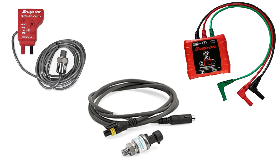 Different pressure transducers and adapters are available for measuring positive and negative gas and liquid pressures. Depending on the adapter, measurement capabilities range from 1 to 5000 psi and up to 29 inHg. Measurement and application capabilities vary per device. The EEMS324PSA Pressure Transducer Adapter allows the use of pressure transducers with the diagnostic tool. It provides 2 channel input and provides power to the pressure transducers. Typical applications include ABS, PS, transmissions, hydraulics, and fuel system tests. The Pressure Transducer Adapter has a LED power indicator, On/Off switch, three color-coded 12” flexible leads with insulated connectors, and requires a 9V battery, which is included. Transducer/cable kits listed below are not included. 0-100 PSI Pressure Transducer - Part# EEPV302AL 0-500 PSI Pressure Transducer - Part# EEPV302AT 0-5000 PSI Pressure Transducer - Part# EEPV302AH Visit your Snap-on website store, or contact your Snap-on representative. |