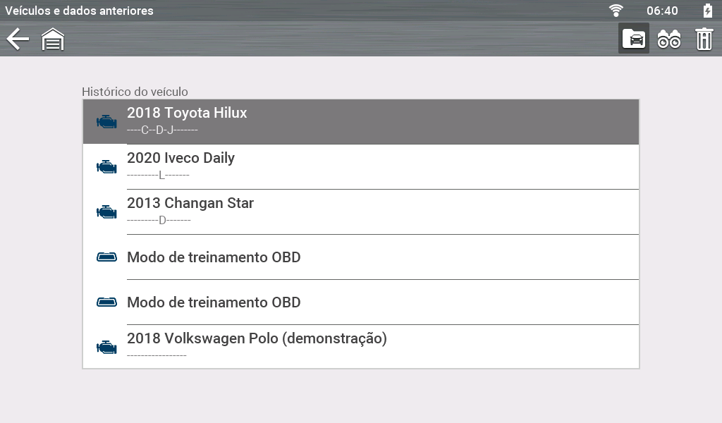 Veículos e dados anteriores > Dados salvos
