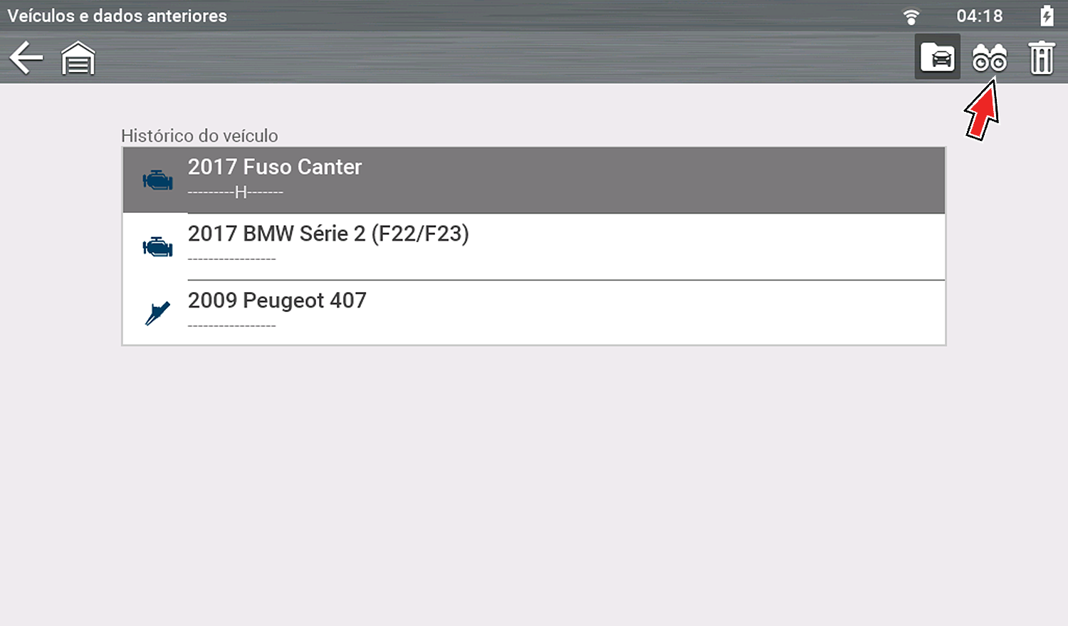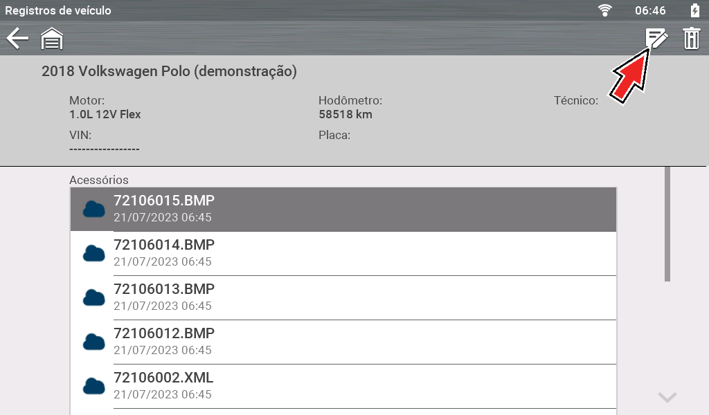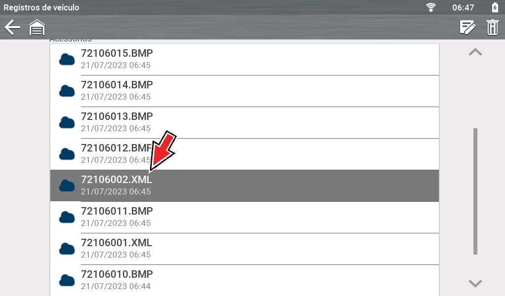 As varreduras de códigos do veículo e de códigos específicos do veículo são salvas na ferramenta em um arquivo no formato .XML. Selecione o arquivo na lista para visualizá-lo.