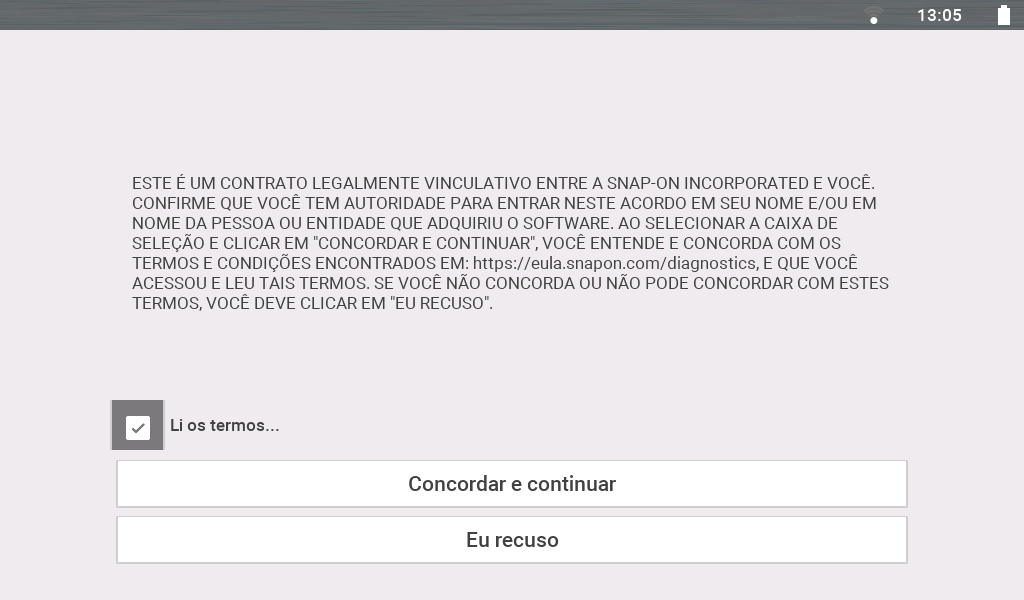 O uso do software é regido pelos termos e condições do Contrato de Licença do Usuário Final. A ferramenta de diagnóstico não deve ser operada inicialmente até que o Contrato de Licença do Usuário Final seja lido. O uso do dispositivo confirma sua aceitação do Contrato de Licença do Usuário Final. O Contrato de Licença do Usuário Final do software da Snap-on Incorporated está disponível no site: https://eula.snapon.com/diagnostics