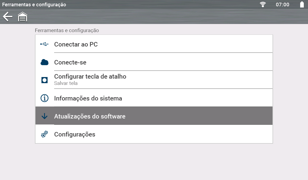 Se você estiver apto(a) para realizar a instalação do software (dependendo da assinatura/status de compra do software) e se a ferramenta de diagnóstico TIVER o recurso Atualização de software, poderá instalar as atualizações de software diretamente para a sua ferramenta de diagnóstico, seguindo as instruções abaixo.
