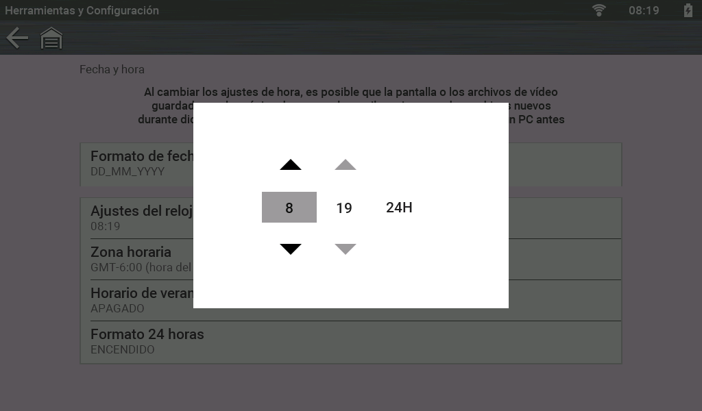 Tools > Settings > System Settings > Date & Time > Clock Settings (Herramientas > Configuración > Configuración del sistema > Fecha y hora > Configuración del reloj)