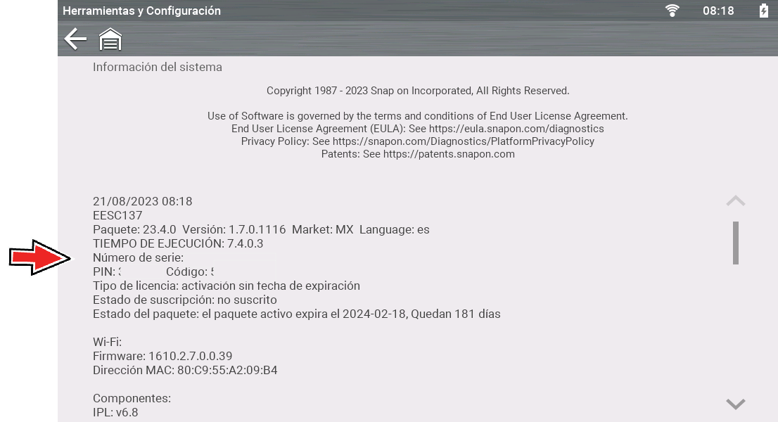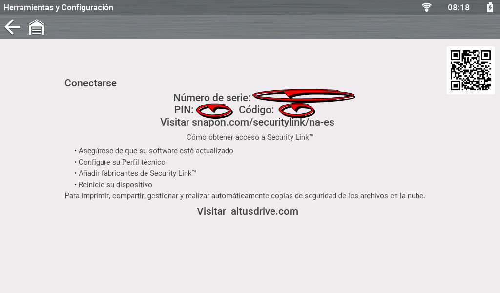 Esta pantalla muestra el número de serie, el PIN y el código de la herramienta de diagnóstico que se utilizan para vincular la herramienta a su perfil técnico de Snap-on (que le permite utilizar otras aplicaciones, como Snap-on Cloud y Security Link).