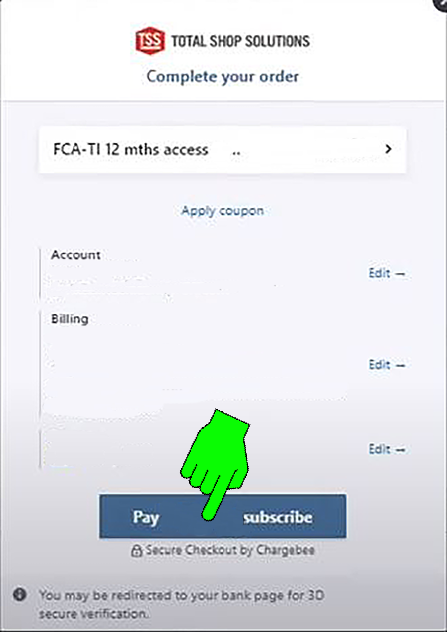 Envíe el pago para activar su suscripción a Snap-on Total Shop Solutions. |