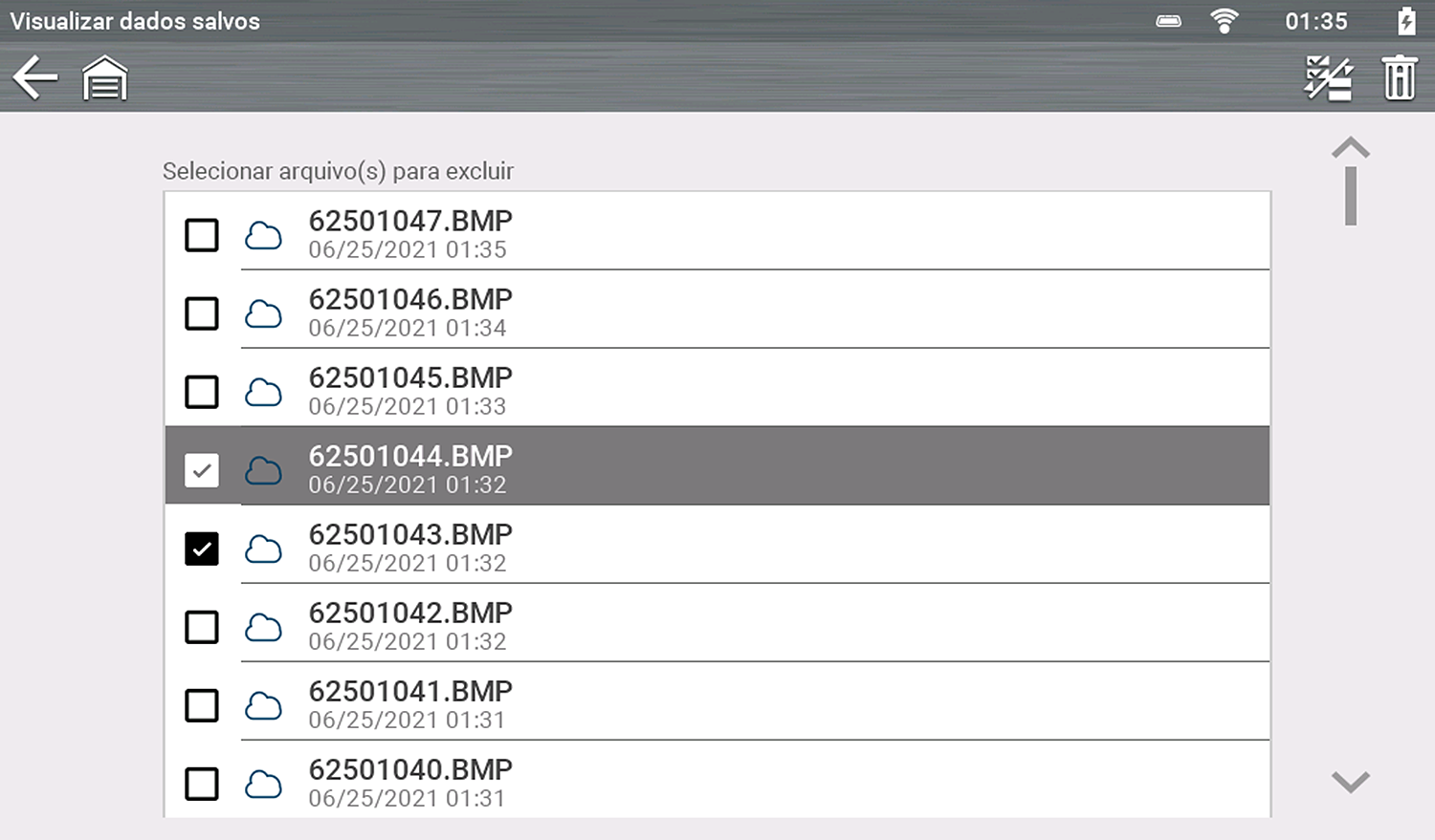 É exibida uma lista de todos os arquivos de dados salvos e imagens da tela que estão armazenados na memória. Selecione o arquivo na lista para visualizá-lo.