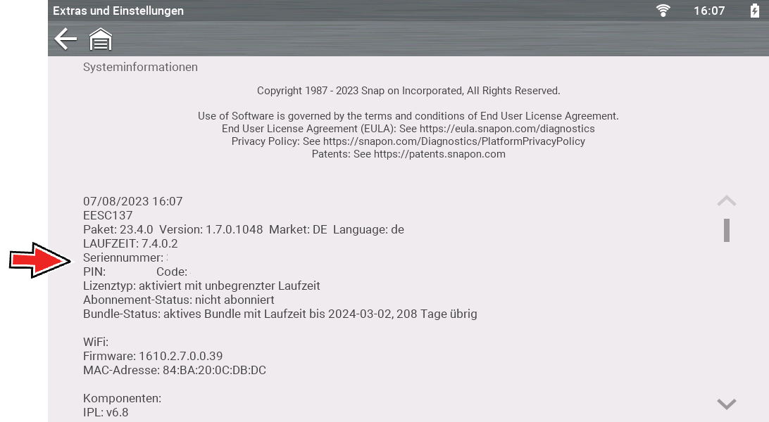 Auf diesem Bildschirm werden die Seriennummer des Diagnosewerkzeugs, die PIN und der Code angezeigt, die verwendet werden, um Ihr Werkzeug mit Ihrem Snap-on-Technikerprofil zu verknüpfen (damit Sie andere Apps wie die Snap-on Cloud und Security Link nutzen können).