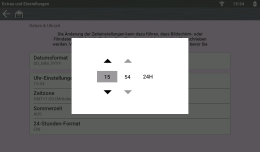 „Tools“ (Extras) > „Settings“ (Einstellungen) > „System Settings“ (Systemeinstellungen) > „Date & Time“ (Datum und Uhrzeit) > „24 Hour Format“ (24-Stunden-Format)