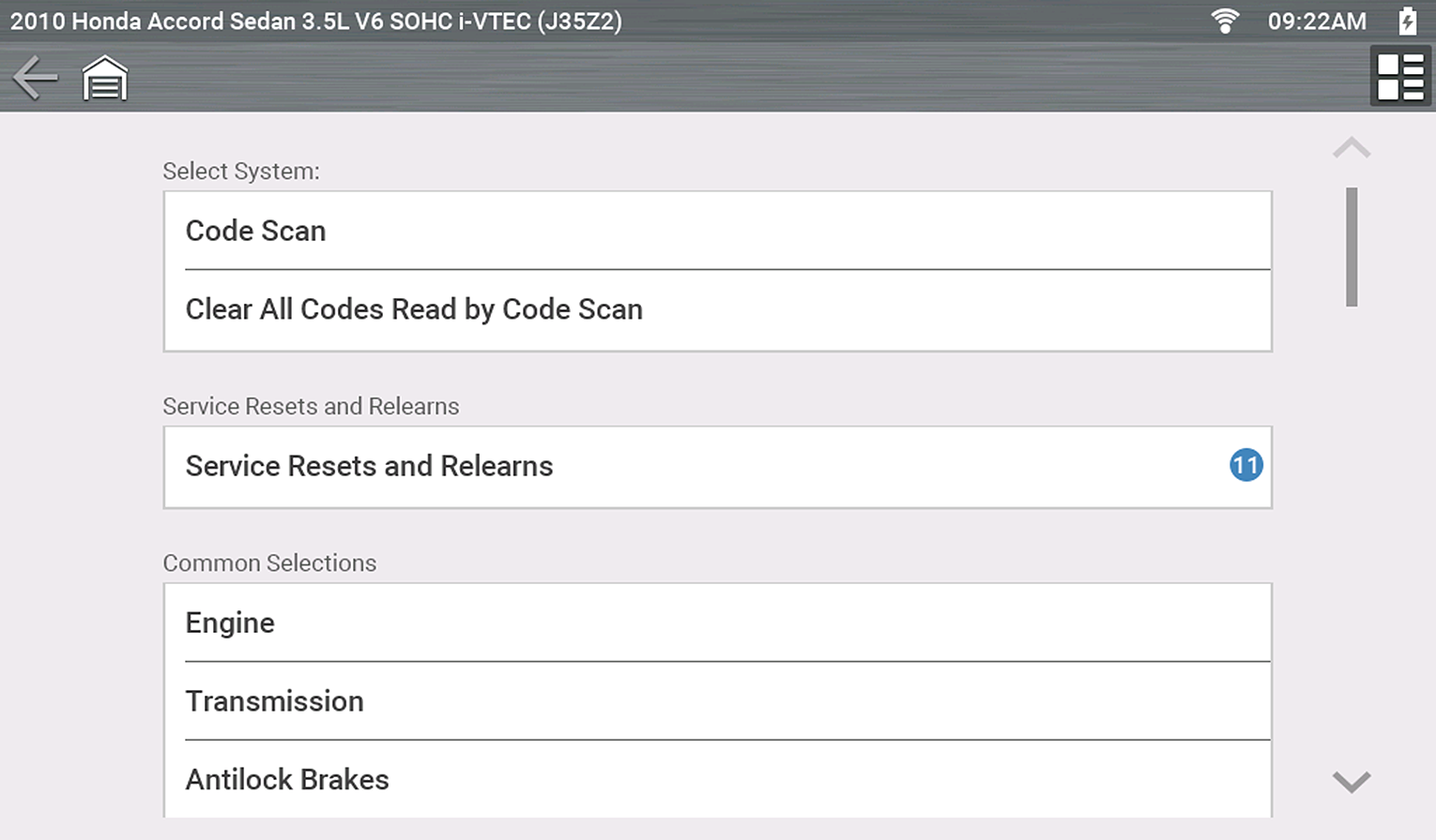 Only the systems/ test options supported for the vehicle are displayed.