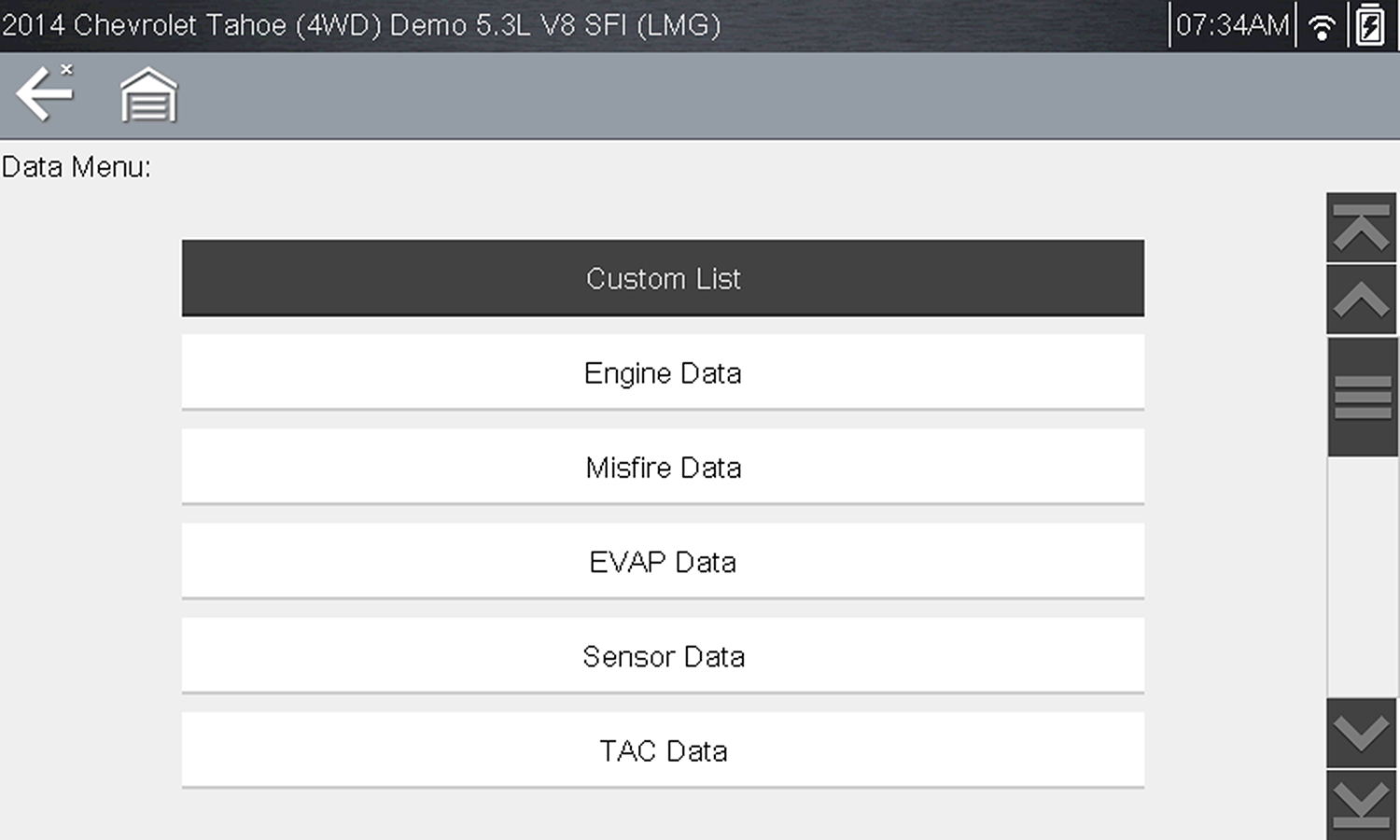 From the Custom Data list, if you select Back to display the Data Menu list, your new Custom List shows as a selectable option at the top of the list. This Custom List option will only remain an option as long as you are in the Data Menu. This allows you to view other data lists and return to your Custom List, however, if you back out to the Main Menu, and then return to the Data Menu your Custom List is deleted.