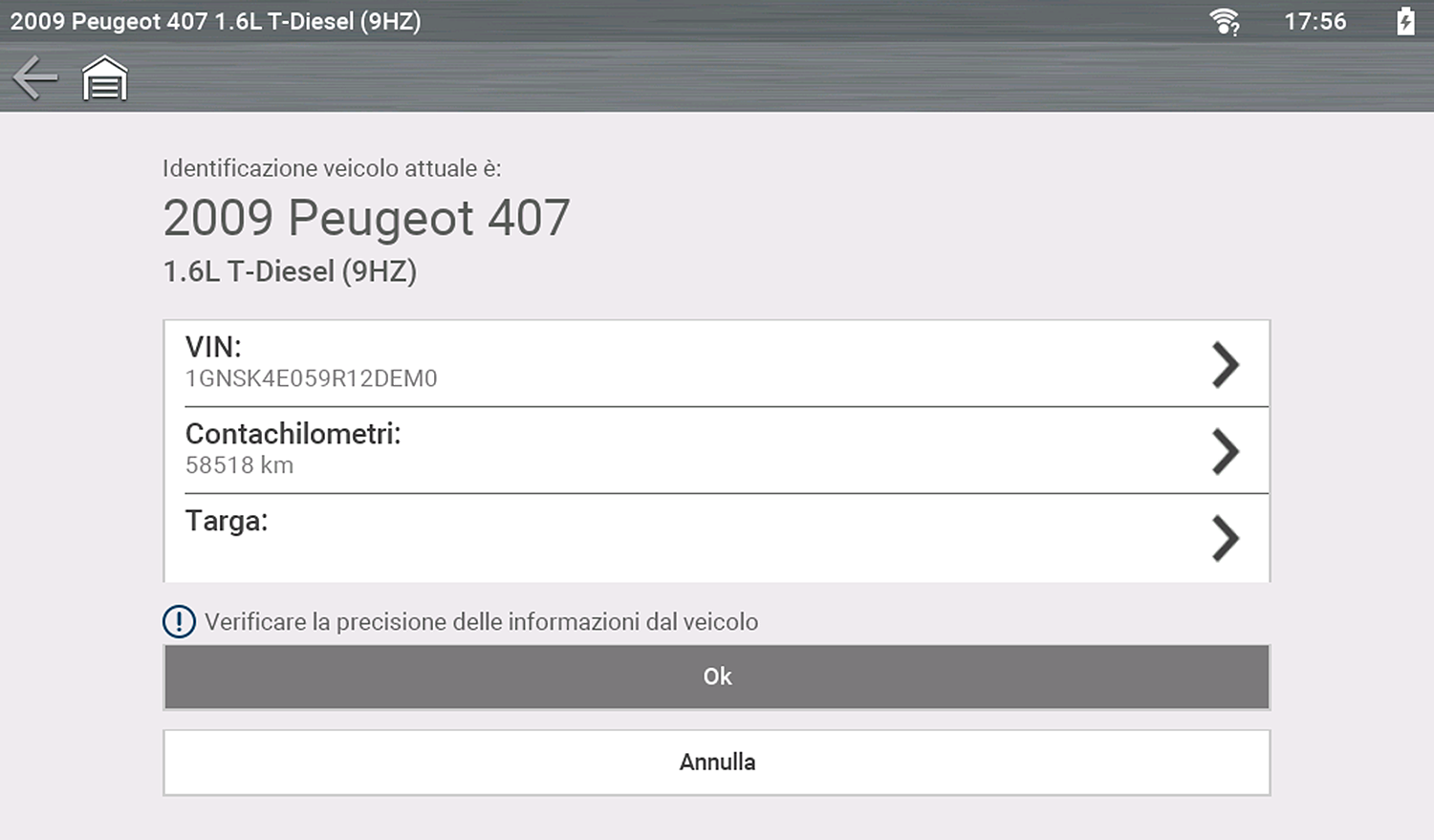 Dopo circa 6 secondi dall'avvio, si attiva un segnale acustico se il VIN viene letto e confermato; premere OK per proseguire.