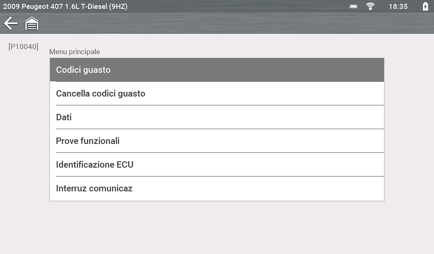 | 7. | Selezionare una prova/funzione del sistema del veicolo(p.es. menu codici) da eseguire. |