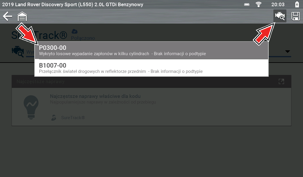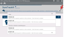 | 2. | Jeśli występują kody usterek DTC, wybierz opcję DTC lub ikonę Diagnose (Diagnostyka), aby wyświetlić powiązane informacje SureTrack. |