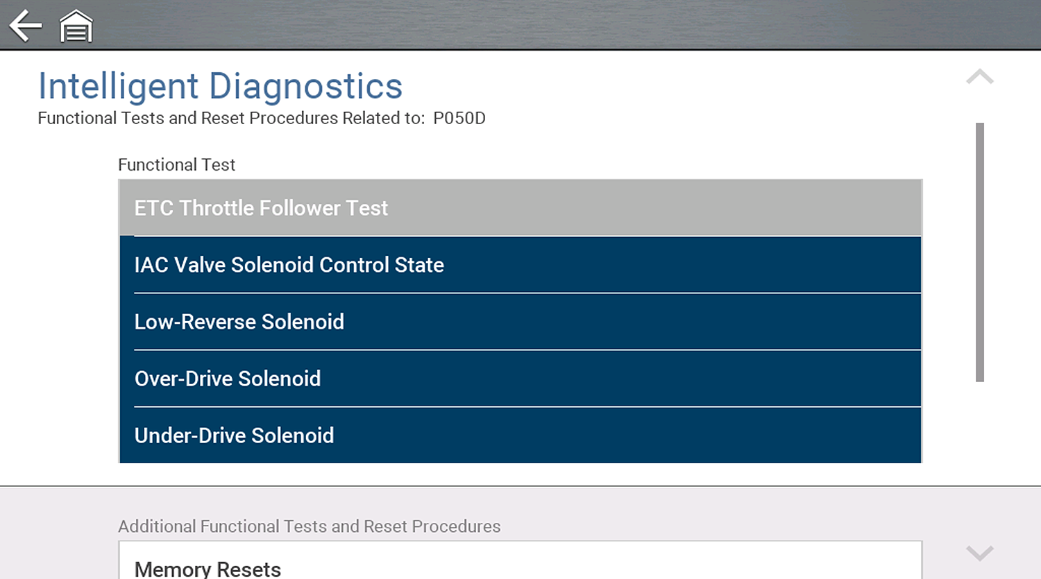 The upper list provides Functional Tests and Reset options related to the selected code. The lower list may provide additional Functional Tests and Reset options that are not code related, but are vehicle specific and may be useful in troubleshooting or validating repairs.
