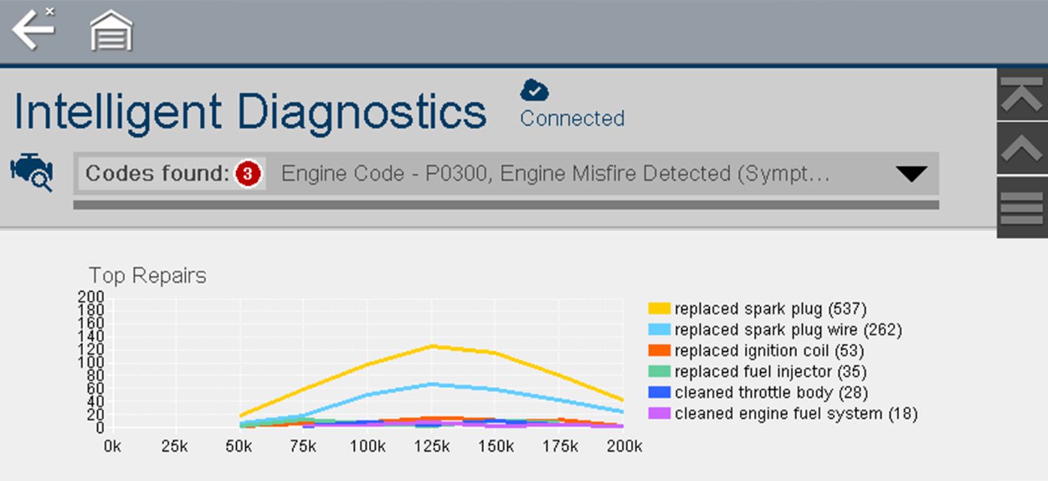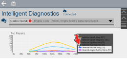 Example - In the graph shown below, the most common fix for the code was replacing the intake manifold gasket. This fix occurred 413 times, with the most occurrences (85) at 100k miles in vehicles with up to 200k miles.