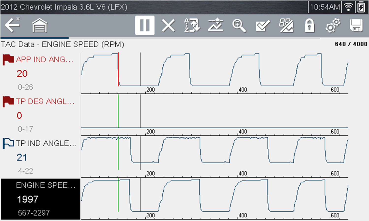 | ● | A green cursor line is displayed on all the other PID graphs to indicate their relationship to where the trigger occurred. |