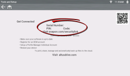 This screen displays the diagnostic tool Serial Number, PIN and Code, that are used to link your tool to your Snap-on Technician Profile (which allows you to use other apps like the Snap-on Cloud and Security Link).