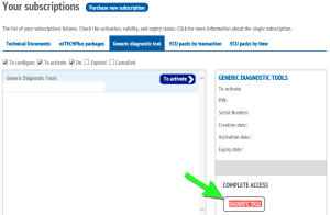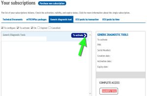 | 15. | Po przetworzeniu płatności musisz aktywować swoją subskrypcję. Kliknij ikonę swojego profilu (tak jak poprzednio), aby uzyskać dostęp do menu głównego, po czym wybierz opcję Your subscriptions (Twoje subskrypcje). Następnie wybierz kartę Generic diagnostic tool (Ogólne narzędzie diagnostyczne) i kliknij strzałkę na przycisku To activate (Aktywacja) w celu aktywacji. |