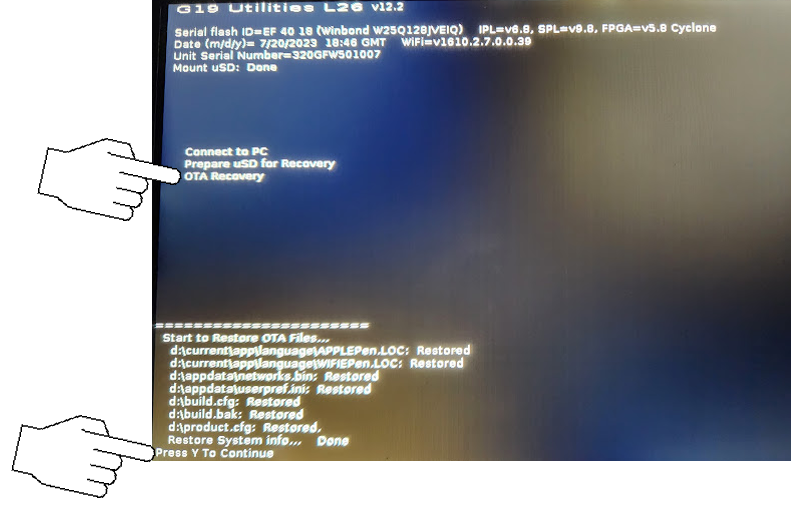 Selezionare Ripristino OTA quindi premere il tasto Y. Seguire le istruzioni visualizzate sullo schermo, premendo il tasto Y per continuare, quindi il tasto N alla richiesta di "interruzione". |