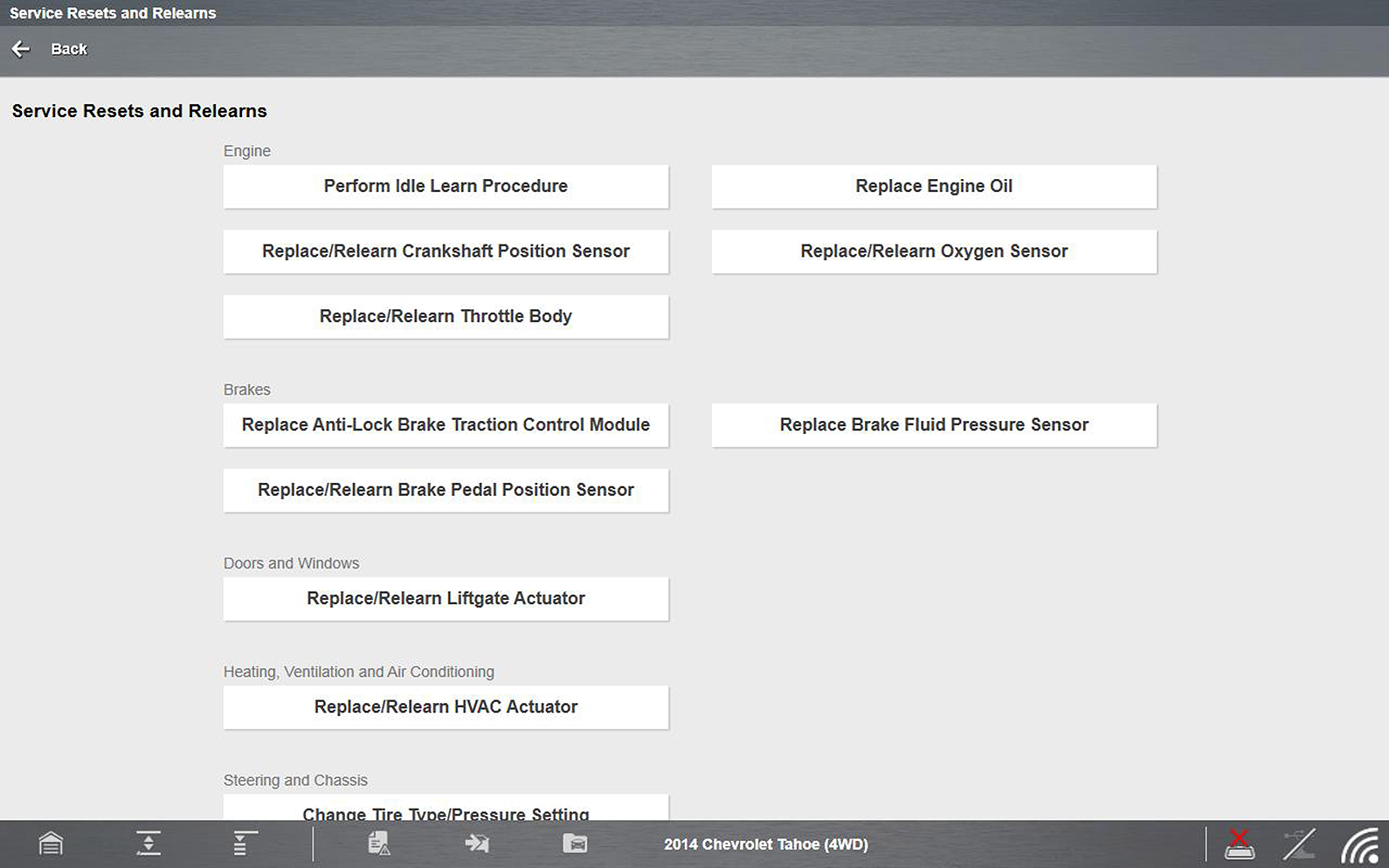 The resets/relearns listed can also be found within the Functional Tests option within each system. Naming conventions may vary.
