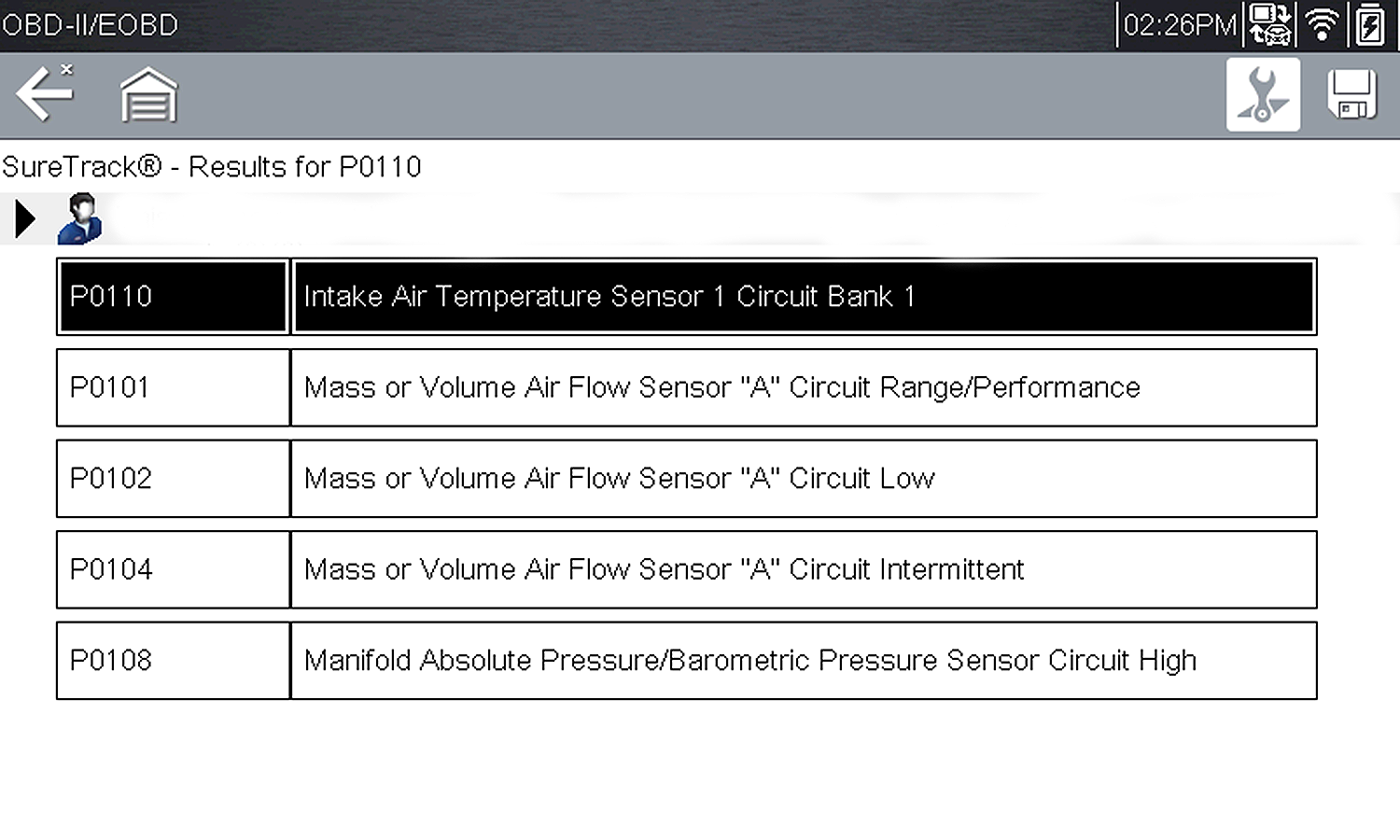 The DTC results screen is similar to the same screen used in the Scanner function, as both display the SureTrack results message below the toolbar. However, SureTrack is not accessible in OBD-II/EOBD mode. SureTrack is only accessible in the Scanner function where the vehicle has been identified.