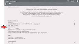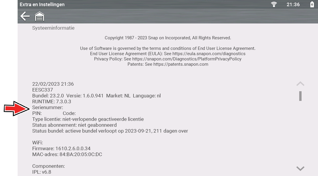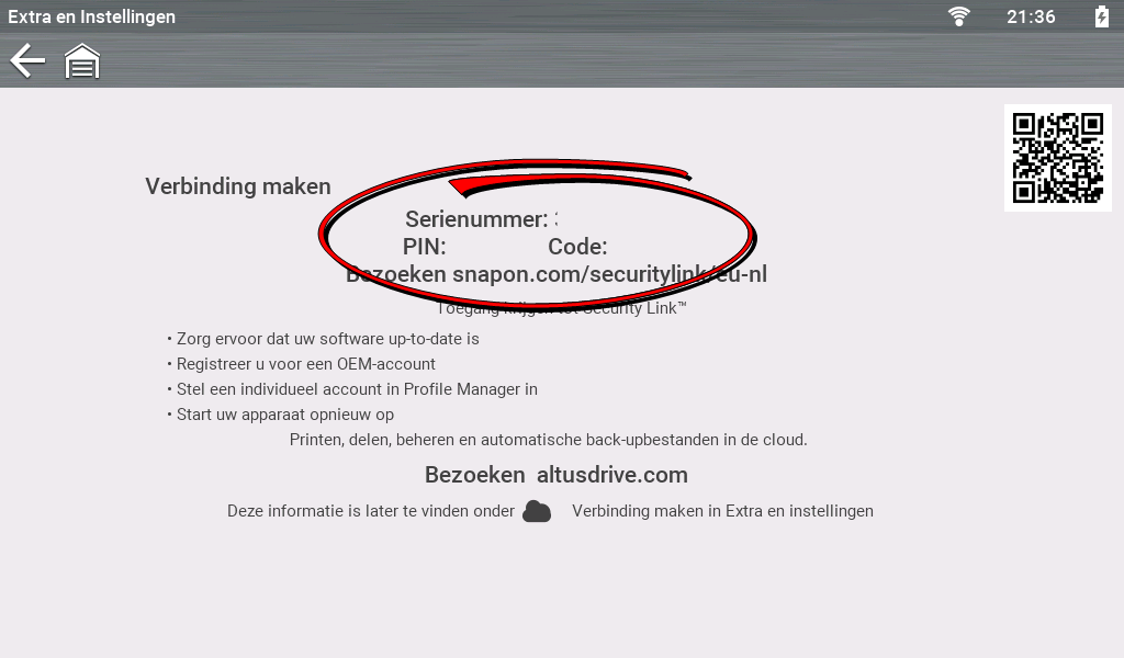 Dit scherm toont het Serienummer, de Pincode en de Code van het diagnose-instrument die worden gebruikt om uw instrument te koppelen aan uw Snap-on Technicus-profiel (waarmee u andere apps kunt gebruiken zoals de Snap-on Cloud en Security Link).