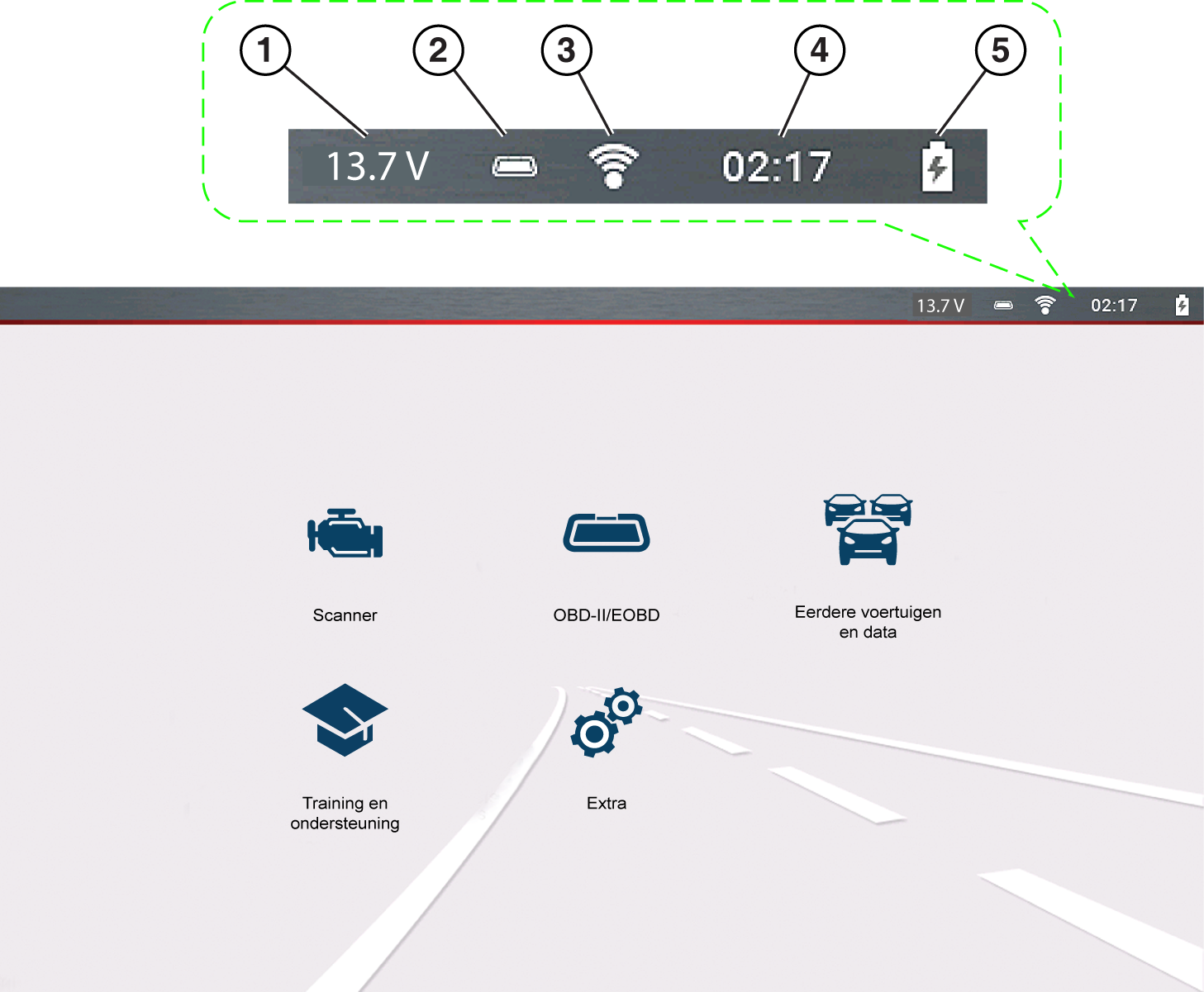 Het beginscherm bevat een titelbalk en hoofgedeelte. Het beginscherm bevat de primaire functiepictogrammen van het diagnose-instrument.