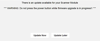 Scan module firmware updates (when available) are delivered with diagnostic software updates/upgrades. Upon starting the Scanner function, initially after a software update or upgrade has been installed, a message may be displayed to inform you an update is available.