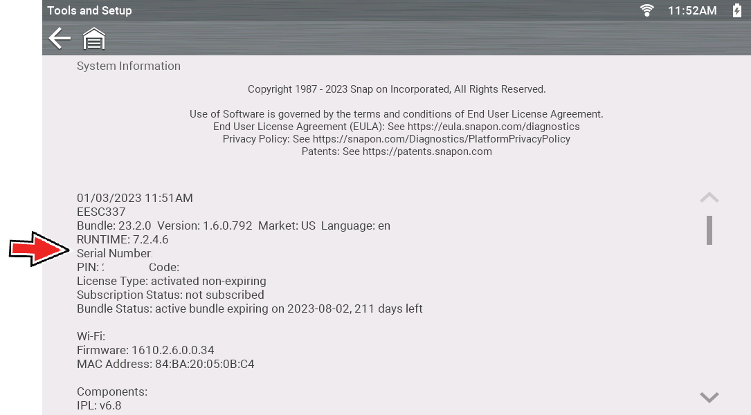 This screen displays the diagnostic tool Serial Number, PIN and Code, that are used to link your tool to your Snap-on Technician Profile (which allows you to use other apps like the Snap-on Cloud and Security Link).