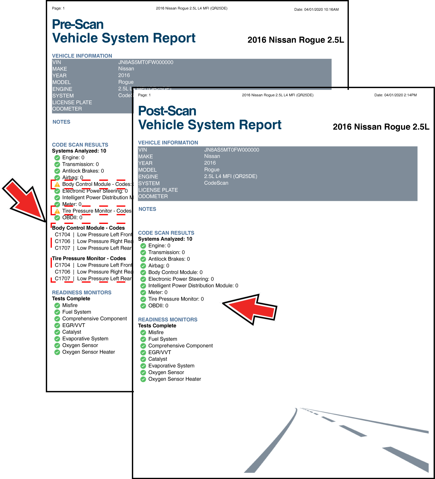 Performing pre and post scans also allows you to record in report format the pre-condition of the vehicle and compare the post scan after work is complete to confirm the repairs were completed properly.